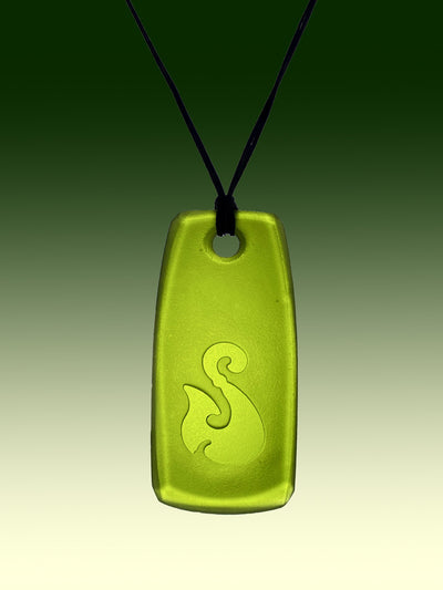 This pendant has a Hei Matau (Māori fishhook) design sandblasted into the glass