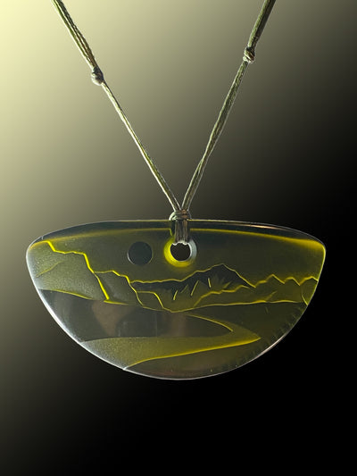 This pendant have been carefully designed and sandblasted with a mountain landscape design into the smooth tumble polished glass surface. Faint maker's marks from the original bottle can be seen on the back.