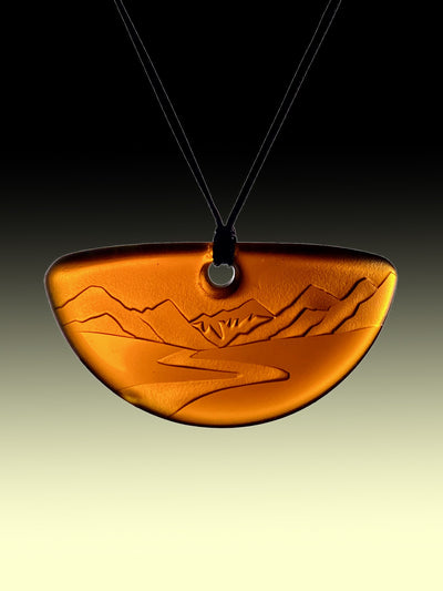This pendant has been carefully designed and sandblasted with a unique hand drawn landscape design on the front, and is smooth tumble polished glass on the back. The colour is a gorgeous warm orangey-brown.