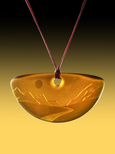 This pendant has been carefully designed and sandblasted with a hand-drawn unique landscape design on the front, and is smooth tumble polished glass on the back. The colour is a gorgeous warm orangey-brown.