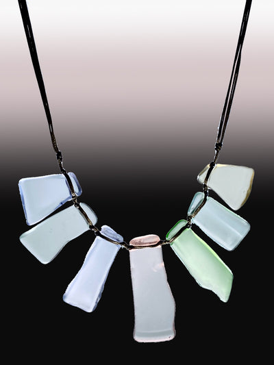 These “Rays of Light” are individually handmade by Brendon. He carefully composes each necklace from his collection of vintage and rare glass. No two are the same.