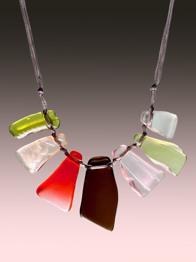 These “Rays of Light” are individually handmade by Brendon. He carefully composes each necklace from his collection of vintage and rare glass. No two are the same.
