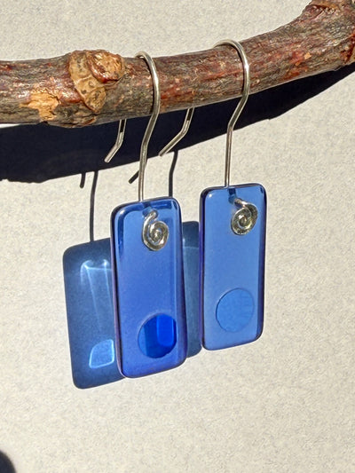 These earrings and the ear wires are 100% hand made by Buzz. They are cut from glass bottles, paired up, ground, designed, sandblasted and drilled all by him in his workshop at the back of his family home in Invercargill.