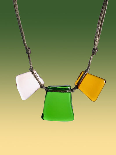 These “Rays of Light” are individually handmade by Brendon. He carefully composes each necklace from his collection of vintage and rare glass. No two are the same.