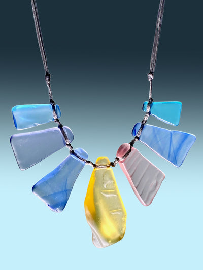 These “Rays of Light” are individually handmade by Brendon. He carefully composes each necklace from his collection of vintage and rare glass. No two are the same.