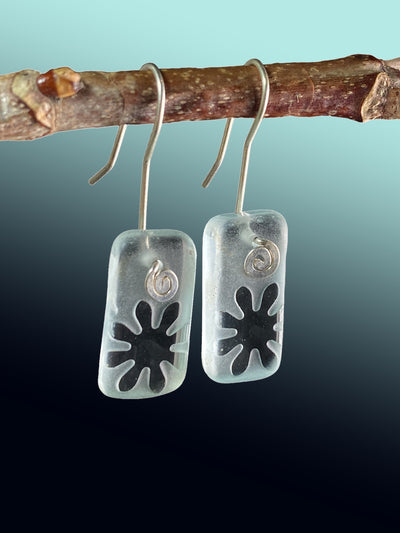 These earrings and the ear wires are 100% hand made by Buzz. They are cut from glass bottles, paired up, ground, designed, sandblasted and drilled all by him in his workshop at the back of his family home in Invercargill.