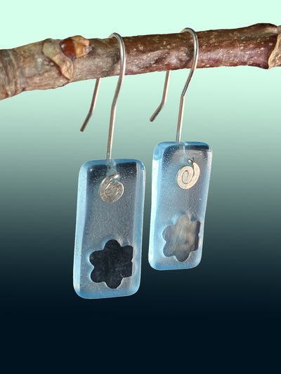 These earrings and the ear wires are 100% hand made by Buzz. They are cut from glass bottles, paired up, ground, designed, sandblasted and drilled all by him in his workshop at the back of his family home in Invercargill.