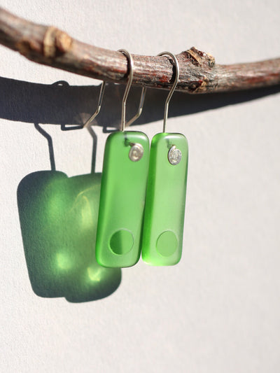 These earrings and the ear wires are 100% hand made by Buzz. They are cut from glass bottles, paired up, ground, designed, sandblasted and drilled all by him in his workshop at the back of his family home in Invercargill.