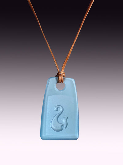 This pendant has a hei matau (fish hook) design sandblasted into the back, and a clear panel in the front to highlight the light refraction within the glass.