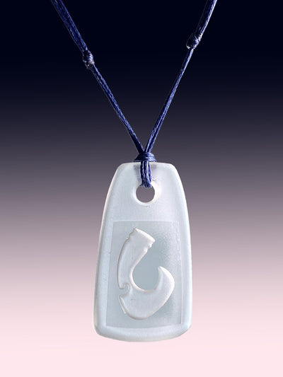 This pendant has a hei matau (fish hook) design sandblasted into the back, and a clear panel in the front to highlight the light refraction within the glass.