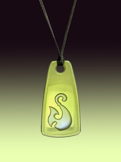 This pendant has a hei matau (fish hook) design sandblasted into the back, and a clear panel in the front to highlight the light refraction within the glass.