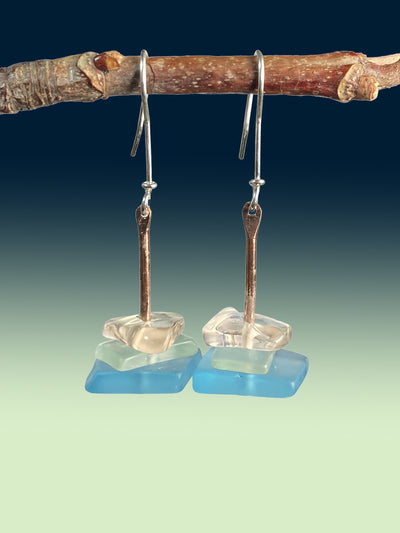Carefully selected, cut and tumbled from Brendon's extensive collection of vintage and modern discarded glass, these earrings feature three chips of coloured glass, drilled and suspended on a forged copper rod. The hooks are sterling silver and are designed to stay well in your pierced ear.