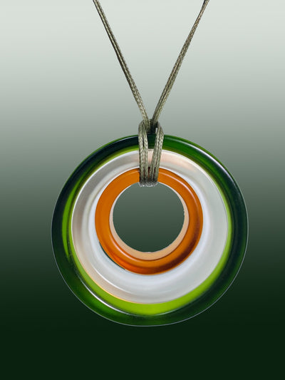 Brendon cuts slices from the necks and bodies of bottles and tumbles them in beach sand that he has filtered, until the edges are smooth and round. He then matches them up, carefully fitting sizes and colours together to compose these pendants.