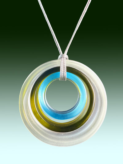 Brendon cuts slices from the necks and bodies of bottles and tumbles them in beach sand that he has filtered, until the edges are smooth and round. He then matches them up, carefully fitting sizes and colours together to compose these pendants.