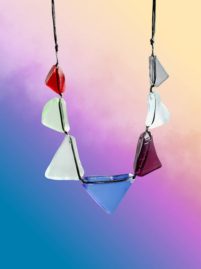 These “Rays of Light” are individually handmade by Brendon. He carefully composes each necklace from his collection of vintage and rare glass. No two are the same.